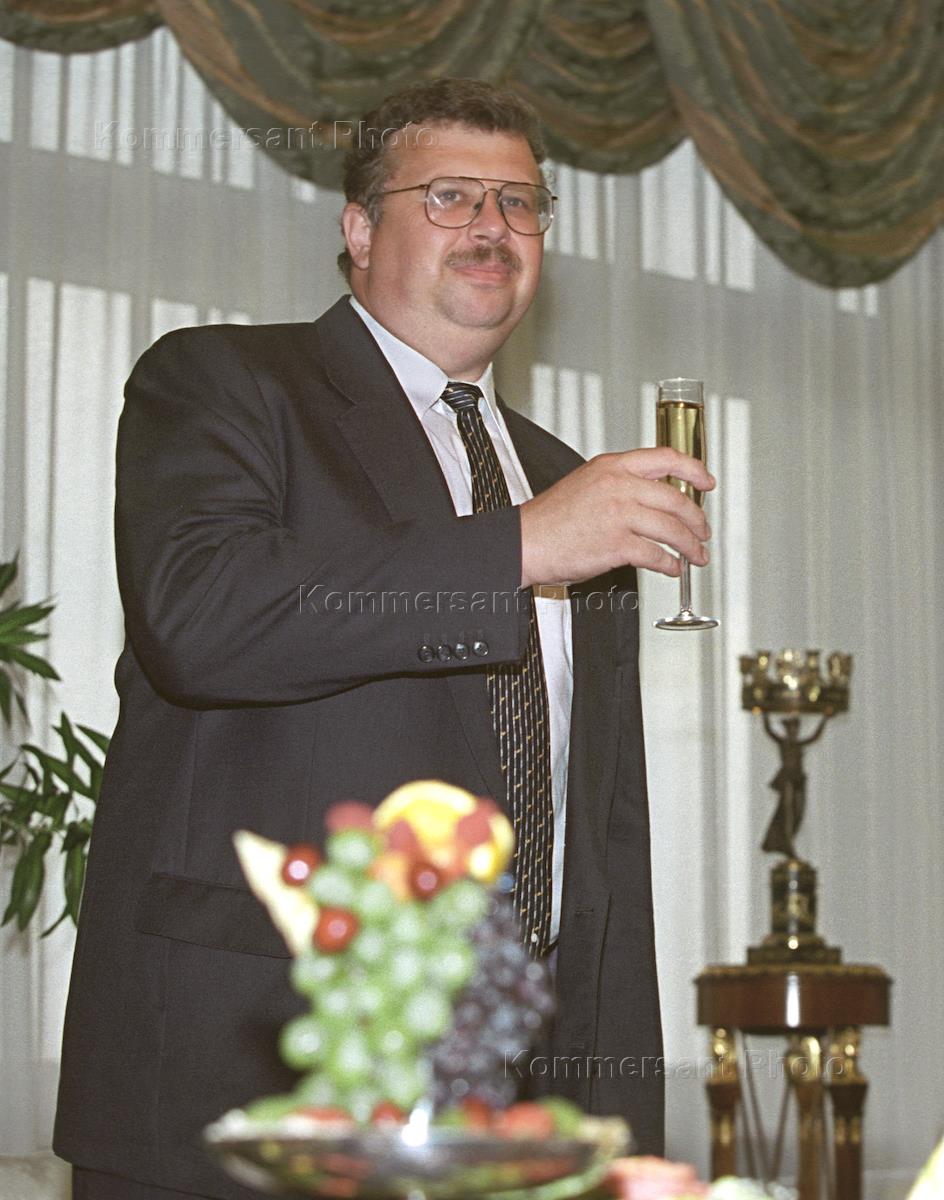 Генеральный директор ФГУП "РОСОБОРОНЭКСПОРТ" Андрей Бельянинов с бокалом шампанского на фуршете после подписания соглашения между ЛУКойлом и Оборонэкспортом.