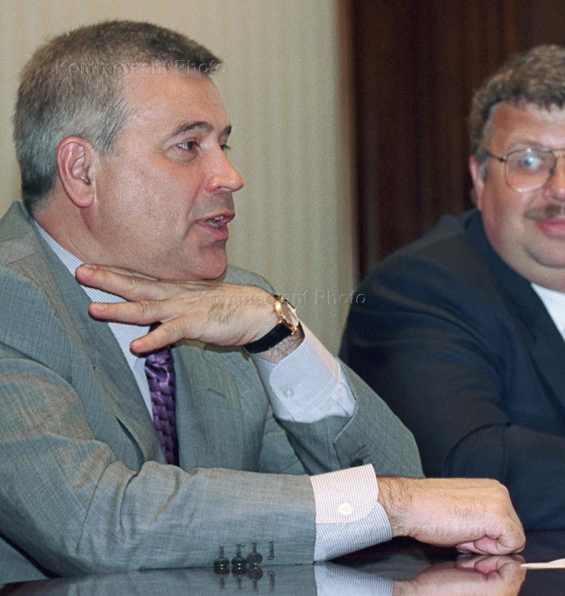 Генеральный директор ФГУП "РОСОБОРОНЭКСПОРТ" Андрей Бельянинов (слева) и президент нефтяной компании "ЛУКойл" Вагит Алекперов с бокалами на фуршете после подписания соглашения между ЛУКойлом и Оборонэкспортом.
