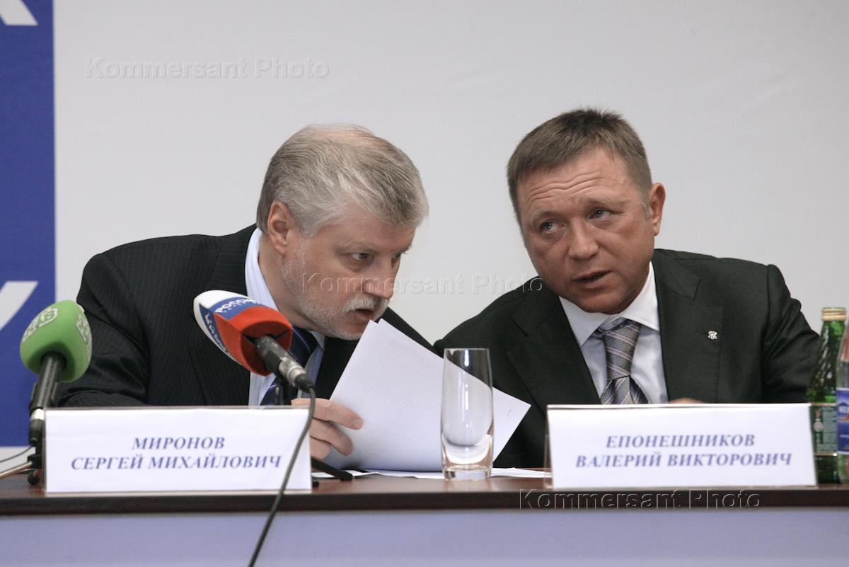 Руководитель партии "Справедливая Россия", председатель Совета Федерации России Сергей Миронов (слева) и первый заместитель председателя генерального совета Социалистической единой партии России (СЕПР) Валерий Епонешников (справа) на чрезвычайном съезде СЕПР. На съезде было принято решение, что Социалистическая единая партия России самоликвидируется, а ее члены войдут в состав партии "Справедливая Россия".