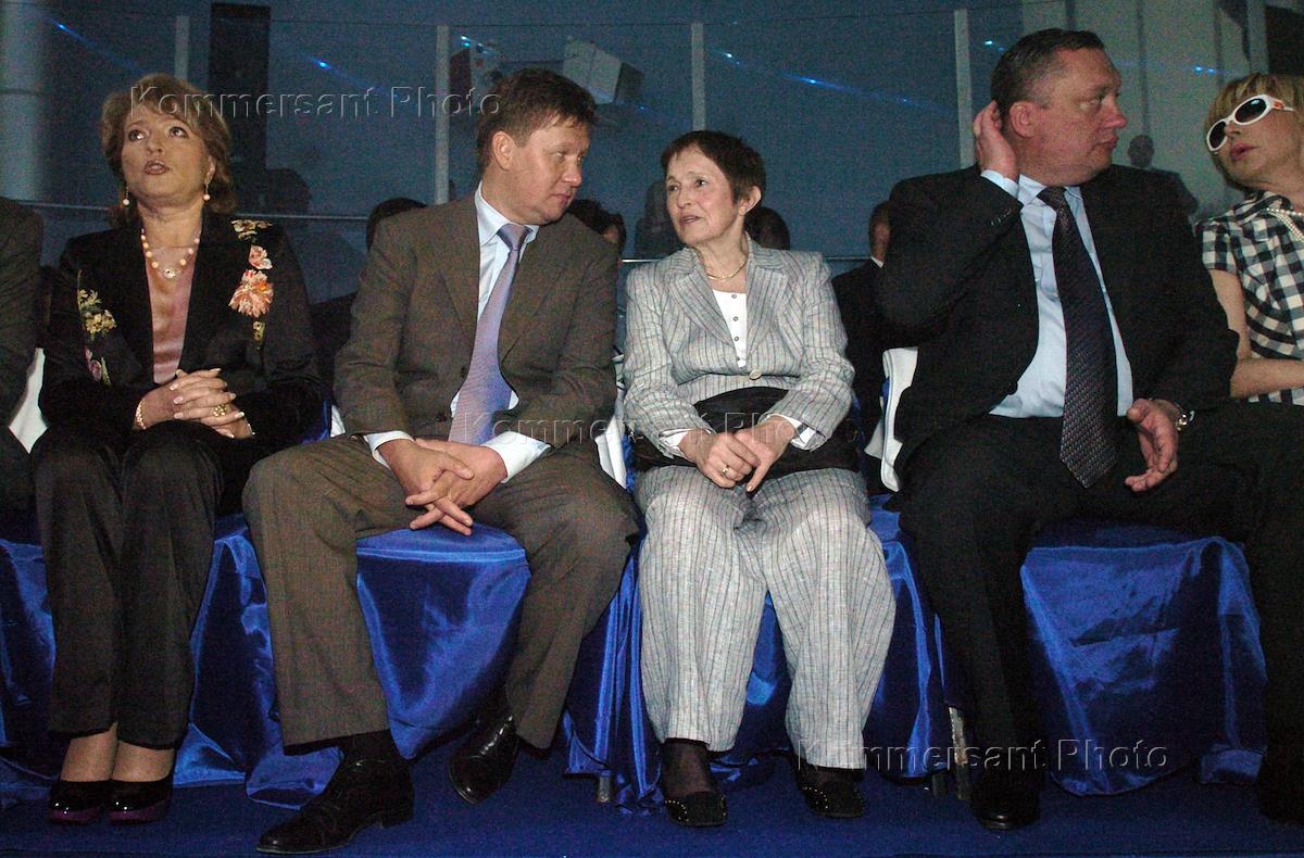 Губернатор Санкт-Петербурга Валентина Матвиенко (слева), глава РАО "Газпром" Алексей Миллер (второй слева), тренер по фигурному катанию Тамара Москвина (в центре) и спикер Законодательного собрания Санкт-Петербурга Вадим Тюльпанов (второй справа) во время церемонии открытия катка "Таврический сад".