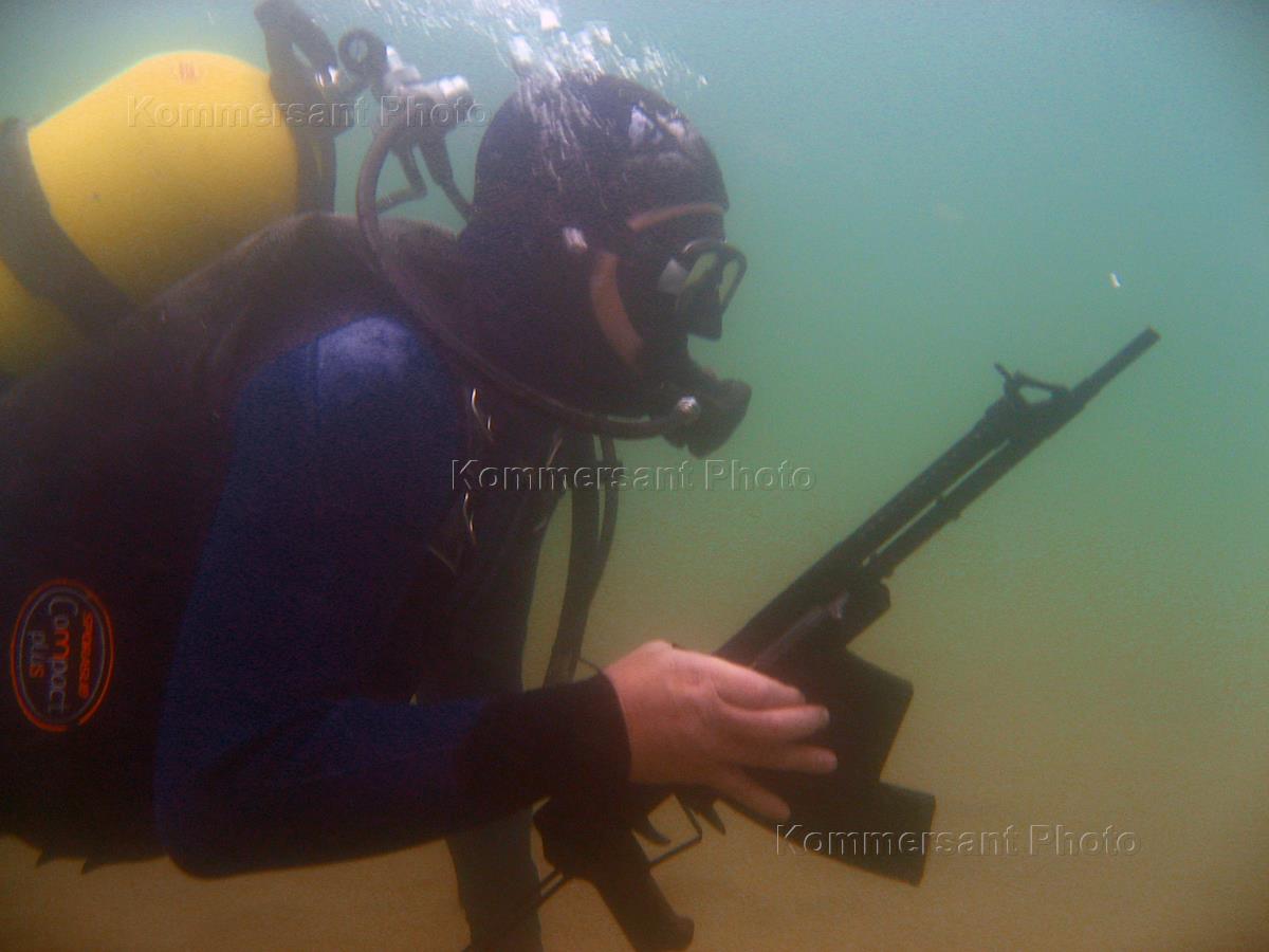 Водолазная база на озере Байкал. Участник военных учений под водой.