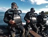 Водолазная база на озере Байкал. Участники военных учений под водой.