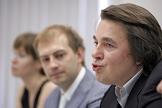 Директор международного вещания "Первого канала" Алексей Ефимов (в центре) и генеральный директор телекомпании "Первый канал" Константин Эрнст (справа) во время пресс-конференции по поводу открытия детского канала "Теленяня". Пресс-конференция прошла в агентстве "Интерфакс".