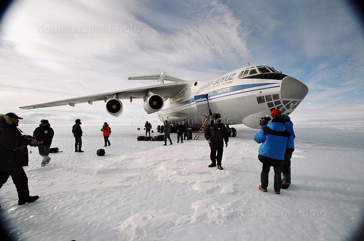 Российская воздушная полярная экспедиция на ледник Пэтриот Хиллз на транспортном самолете "Ил 76". Руководитель экспедиции заместитель председателя Государственной Думы России Артур Чилингаров (в центре).