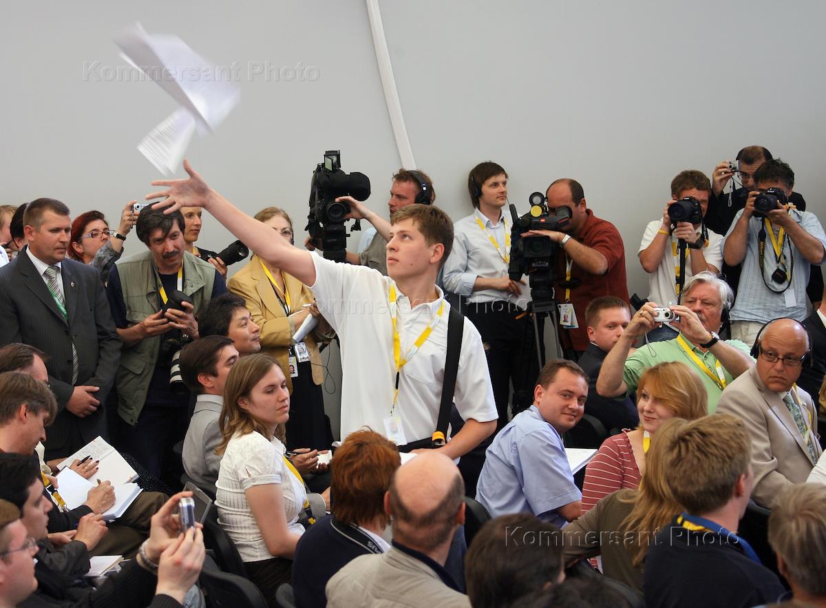 Саммит "G8" ("Большой восьмерки"). Журналист, член партии "Другая Россия" выбросил листовки с обвинениями в адрес Путина в установлении личной диктатуры во время проведения пресс-конференции Президента России Владимира Путина по итогам саммита "G8".