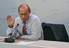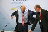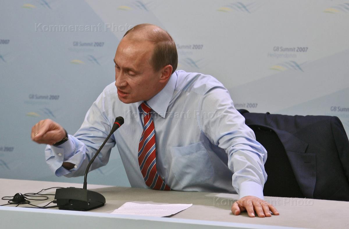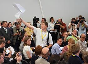 Саммит "G8" ("Большой восьмерки"). Журналист, член партии "Другая Россия" выбросил листовки с обвинениями в адрес Путина в установлении личной диктатуры во время проведения пресс-конференции Президента России Владимира Путина по итогам саммита "G8".