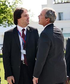 Саммит "G8" ("Большой восьмерки"). Президент США Джордж Буш (справа) перед началом совместного фотографирования глав "G8" в комплексе Курхаус.