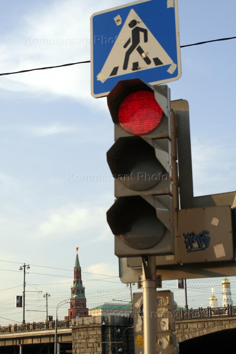 Светофор и табличка "Стоп" на фоне Большого Кремлевского Дворца.