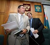 Руководитель Федеральной антимонопольной службы (ФАС) России Игорь Артемьев (справа) и его заместитель Андрей Кашеваров (слева) во время совещания по обсуждению прозрачного механизма ценообразования на телерекламу. Совещание прошло в здании ФАС.