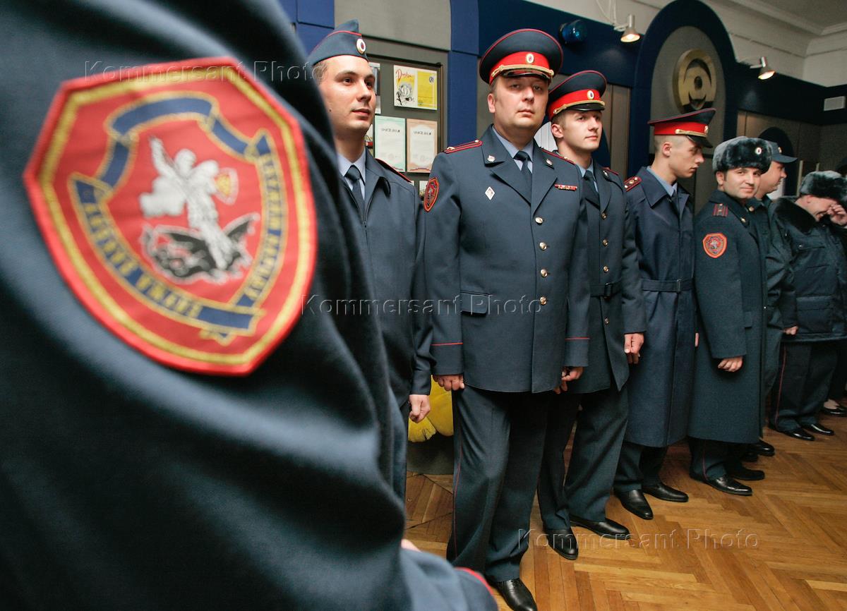 Презентация экспериментальной форменной одежды для милиции и новой формы для военнослужащих внутренней службы МВД России прошла в Центральном музее МВД России. Сотрудники милиции в старой форменной одежде.