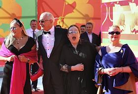 Председатель союза кинематографистов России, кинорежиссер Никита Михалков (второй слева), его супруга, президент благотворительного фонда "Русский силуэт" Татьяна Михалкова (слева), генеральный директор компании "Медиафест" Наталья Семина (в центре) и киновед и продюсер из Финляндии Кирси Тюккюляйнен (справа) во время торжественной церемонии открытия XXIX-ого Московского международного кинофестиваля (ММКФ). Церемония прошла в кинотеатре "Пушкинский".