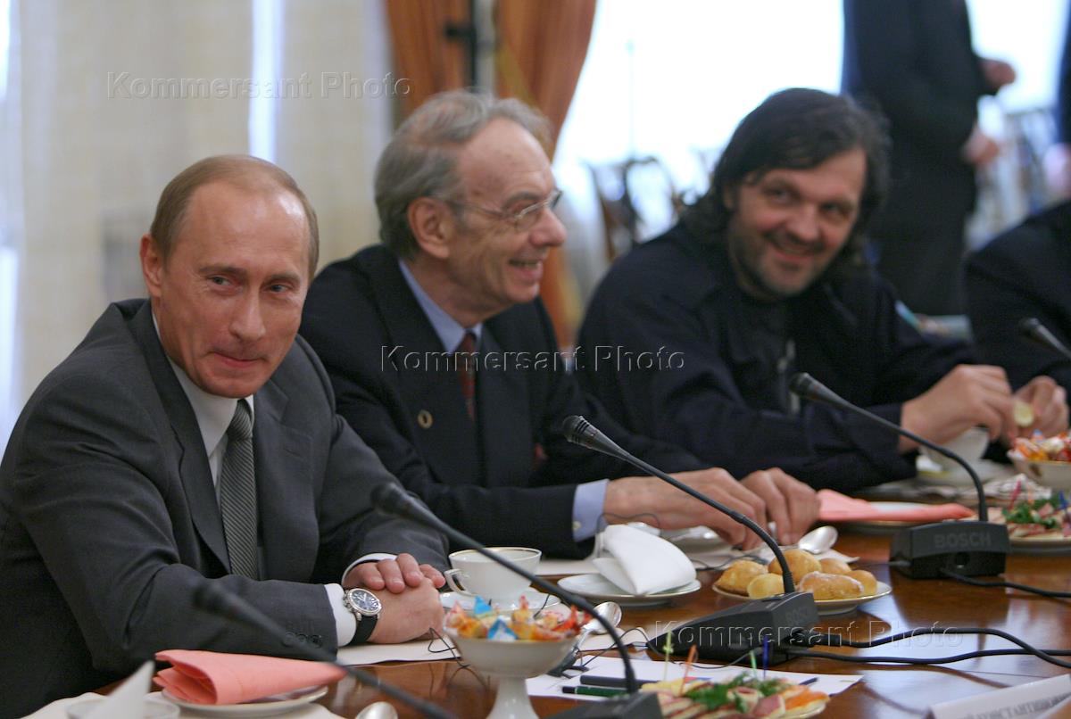 Актер Алексей Баталов (в центре) и режиссер Эмир Кустурица (справа) во время встречи Президента России Владимира Путина (слева) с членами жюри XXIX-ого Московского международного кинофестиваля (ММКФ). Встреча прошла в президентской резиденции в Ново-Огарево.