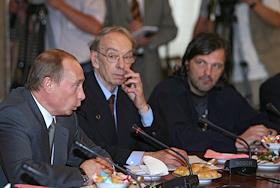 Сценаристка, актриса Рената Литвинова (вторая слева), председатель союза кинематографистов России, кинорежиссер Никита Михалков (в центре) и режиссер Алексей Попогребский (справа) во время встречи Президента России Владимира Путина (слева) с членами жюри XXIX-ого Московского международного кинофестиваля (ММКФ). Встреча прошла в президентской резиденции в Ново-Огарево.