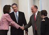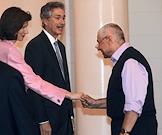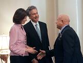 Посол США в России Уильям Бернс (в центре) с супругой Лисой Карти (слева) и летчик-космонавт, сопредседатель Международной ассоциации участников космических полетов Алексей Леонов (справа) во время празднования Дня Независимости США в особняке "Спасохаус".