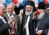 Лидер Коммунистической партии России (КПРФ), член Совета Государственной Думы Геннадий Зюганов (слева) и председатель отдела внешних церковных связей Московского патриархата митрополит Смоленский и Калининградский Кирилл (справа) во время празднования Дня Независимости США в особняке "Спасохаус".