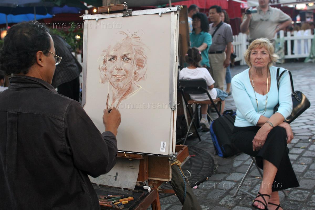 Париж. Монмартр. Художник рисующий портрет женщины.