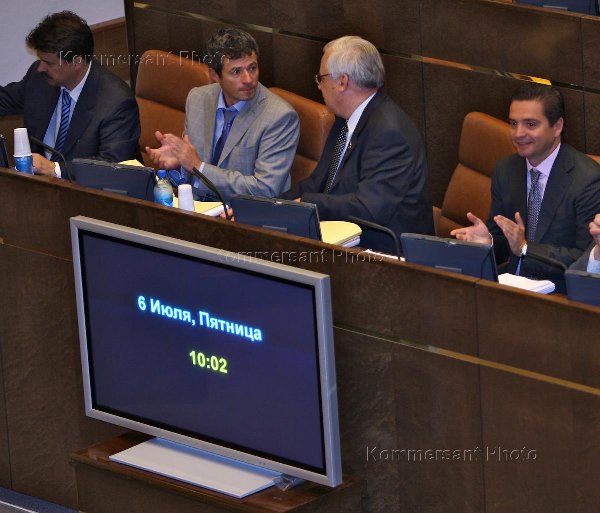Слева направо: представитель в Совете Федерации (СФ) администрации Эвенкийского автономного округа Юрий Шарандин, представитель в Совете Федерации (СФ) России законодательный орган Белгородской области Вадим Мошкович, представитель администрации Белгородской области в Совете Федерации (СФ) России Николай Рыжков и член Совета Федерации России от Ярославской Думы Николай Тонков во время очередного заседания СФ.