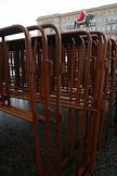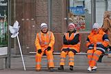 Сотрудницы коммунальной службы отдыхают на автобусной остановке.