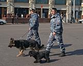Сотрудники правоохранительных органов с собаками во время патрулирования города.