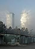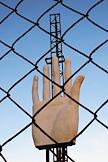 Жанровая фотография. Скульптурная группа: рука и нефтяная вышка, снятые через решетку.