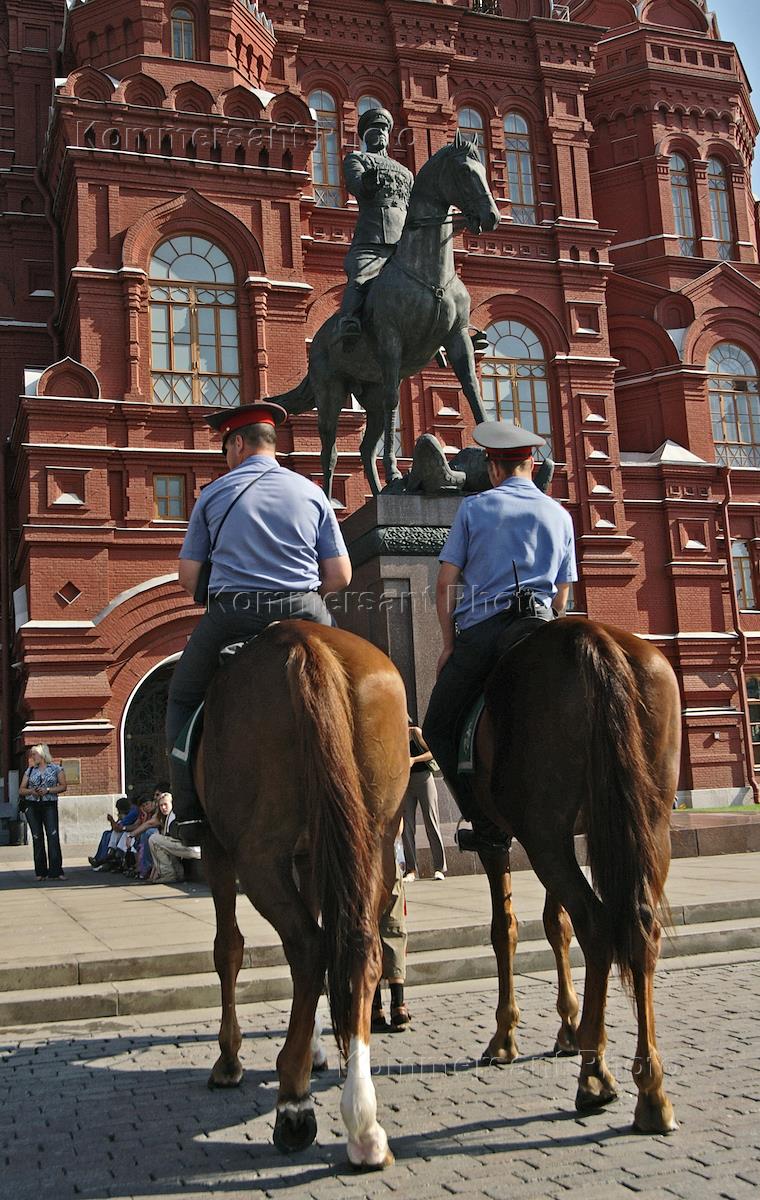 Конная милиция на фоне памятника маршалу Георгию Жукову на Манежной площади.