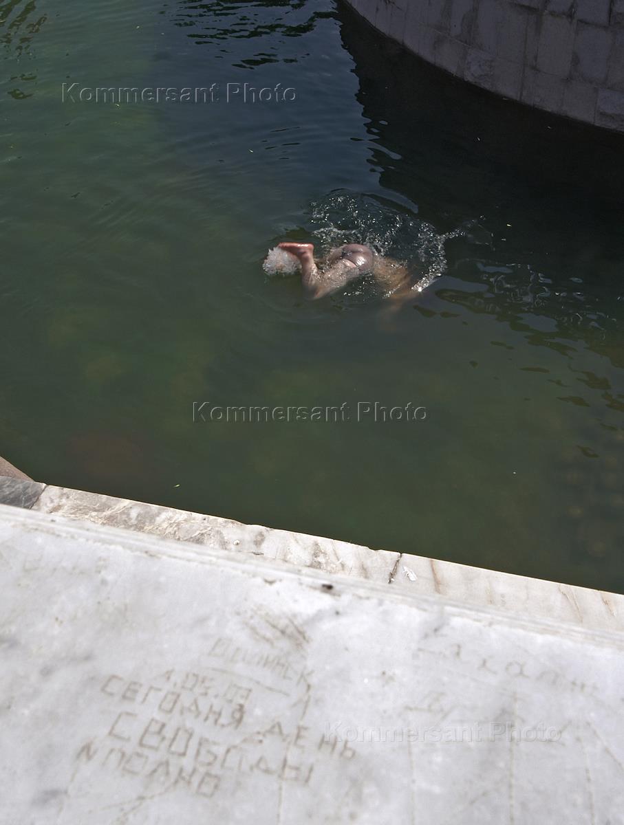 Жара в Москве. Молодежь купается в фонтане на Манежной площади.
