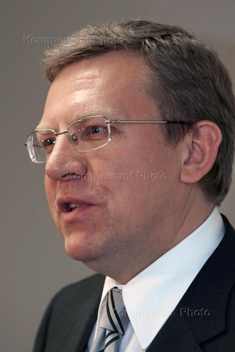 Russian Finance Minister Aleksey Kudrin is shown during press conference.