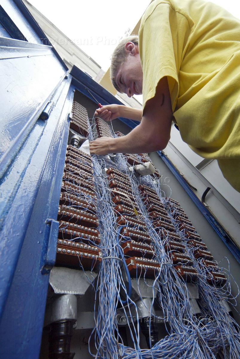 [English translation in progress (2)] The adjuster repairs щиток with telephone wires in the street.