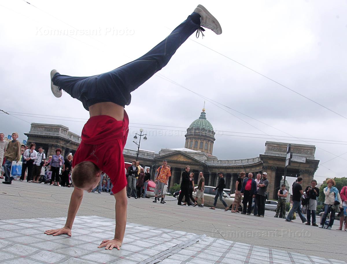 Выступление исполнителей брейкданса на Невском проспекте. Вид на Собор во имя Казанской иконы Божией Матери (Казанский Собор).