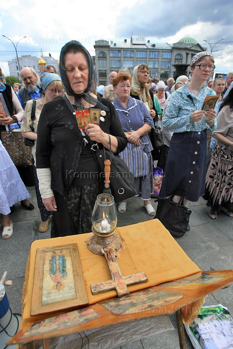 Молитвенное стояние памяти святых царственных мучеников, организованное Союзом православных хоругвеносцев, Союзом православных братств и Союзом "Христианское Возрождение", состоялось на Славянской площади у памятника Святым Равноапостольным Кириллу и Мефодию.