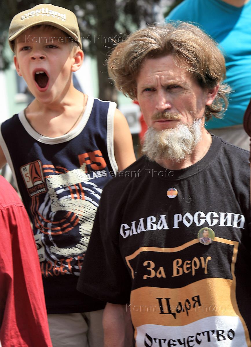 Молитвенное стояние памяти святых царственных мучеников, организованное Союзом православных хоругвеносцев, Союзом православных братств и Союзом "Христианское Возрождение", состоялось на Славянской площади у памятника Святым Равноапостольным Кириллу и Мефодию. Растяжка "Проснись Русская душа; Дай отпор антихристу!".