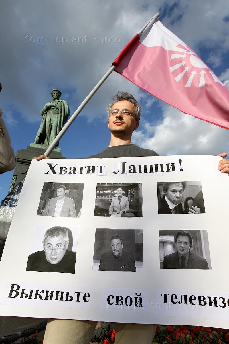 People Democratic Union act of protest against state propaganda and censorship in mass media headlined 'No censorship in mass media! Throw away your TV!.