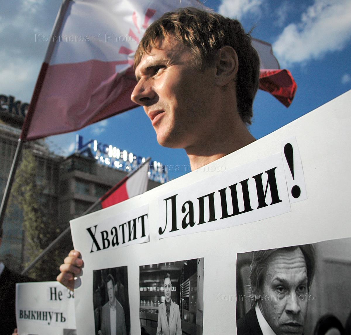 People Democratic Union act of protest against state propaganda and censorship in mass media headlined 'No censorship in mass media! Throw away your TV!.