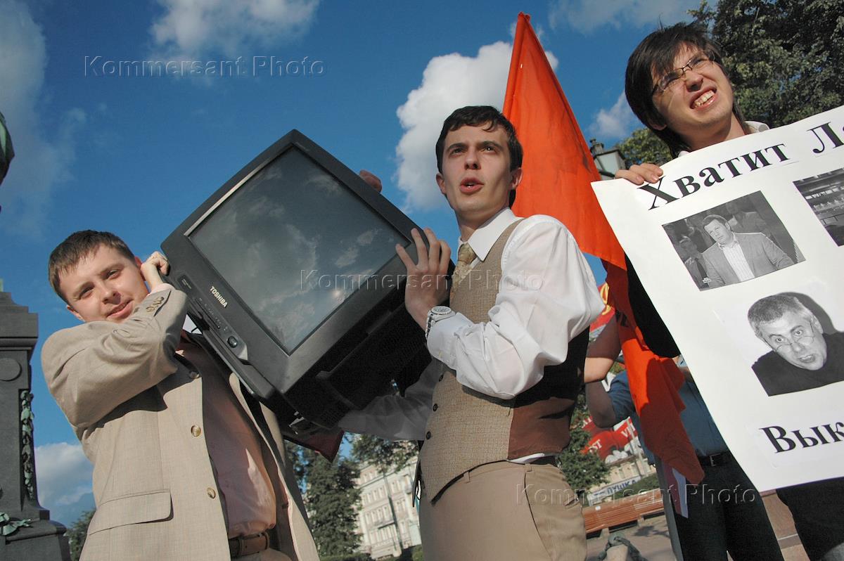 People Democratic Union act of protest against state propaganda and censorship in mass media headlined 'No censorship in mass media! Throw away your TV!.