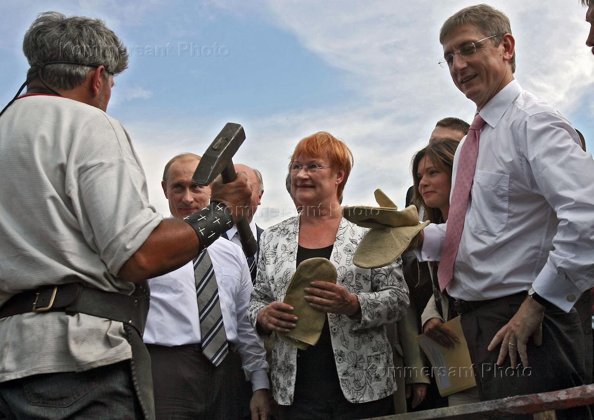 Президент России Владимир Путин (слева), премьер-министр Венгрии Ференц Дюрчань (справа) и президент Финляндии Тарьей Халонен (вторая справа) во время торжественной церемонии открытия Международного фестиваля финно-угорских народов.