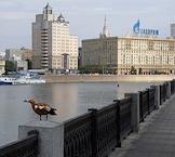 Набережная Москва-реки в районе Кутузовского проспекта. Дикая утка сидит на ограждении реки. Реклама "Газпрома" на крыше жилого дома.