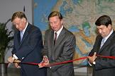 Президент ОАО "Российские железные дороги" (РЖД) Владимир Якунин (в центре), первый заместитель председателя Правительства России Сергей Иванов (слева) и министр транспорта России Игорь Левитин (справа) на презентации Центра инновационного развития ОАО "РЖД" в здании Рижского вокзала.