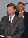 Президент ОАО "Российские железные дороги" (РЖД) Владимир Якунин (справа) и первый заместитель председателя Правительства России Сергей Иванов (в центре) на презентации Центра инновационного развития ОАО "РЖД" в здании Рижского вокзала.