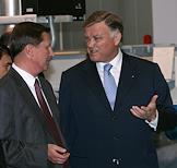 Президент ОАО "Российские железные дороги" (РЖД) Владимир Якунин (справа) и первый заместитель председателя Правительства России Сергей Иванов (слева) на презентации Центра инновационного развития ОАО "РЖД" в здании Рижского вокзала.