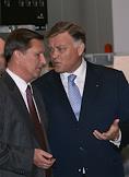 Первый заместитель председателя Правительства России Сергей Иванов (слева) и президент ОАО "Российские железные дороги" (РЖД) Владимир Якунин (справа) на презентации Центра инновационного развития ОАО "РЖД" в здании Рижского вокзала.