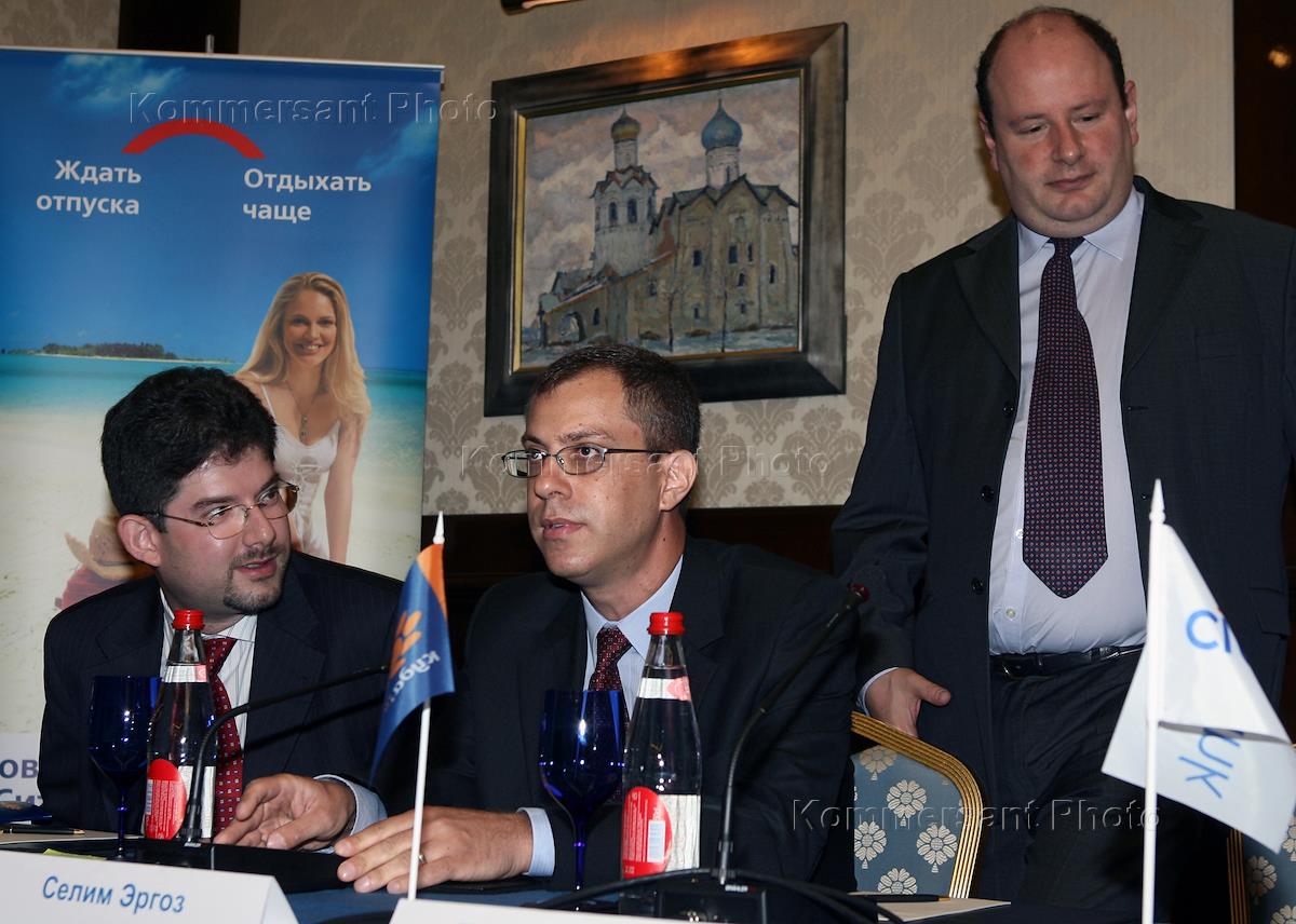 Менеджер по маркетингу кредитных карт ЗАО КБ"Ситибанк" Михаил Бернер (слева), вице-президент ЗАО КБ "Ситибанк", начальник Управления кредитных карт Селим Эргоз (в центре) и глава "Ситибанка" по работе с частными клиентами Джоэл Корнрейх (справа) во время пресс-конференции, посвященной представлению новой ко-брендинговой кредитной карты "Куда.ru - Ситибанк". Пресс-конференция прошла в отеле "Ritz Carlton".