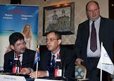 Председатель совета директоров бюро путешествий "Куда.ру" Александр Комарницкий (слева) и менеджер по маркетингу кредитных карт ЗАО КБ"Ситибанк" Михаил Бернер (в центре) во время пресс-конференции, посвященной представлению новой ко-брендинговой кредитной карты "Куда.ru - Ситибанк". Пресс-конференция прошла в отеле "Ritz Carlton".