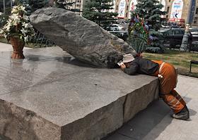 Рабочий с мастерком во время ремонта памятника "Соловецкий камень" на Лубянской площади.