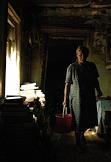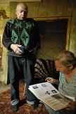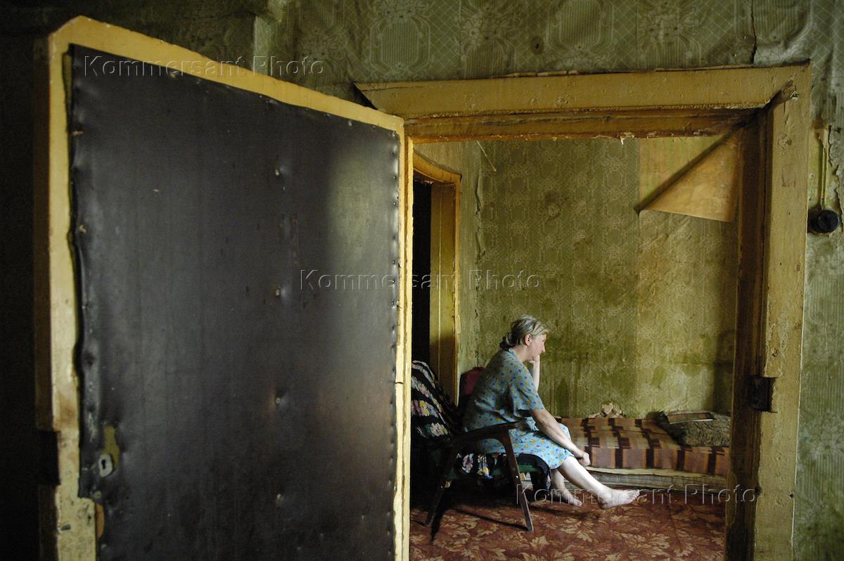 Пожилые люди в заброшенном доме. Женщина БОМЖ выносит ведро с водой.