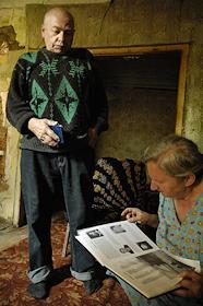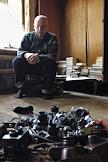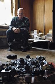 Жителm заброшенного дома. Мужчина сидит перед кучей советских фотоаппаратов.