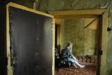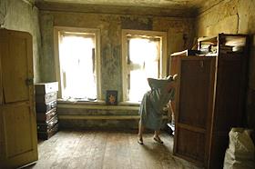Жительница заброшенного дома. Ободранная комната с окнами без стекла.