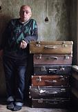 Житель заброшенного дома. Мужчина стоит оперевшись на чемоданы на фоне ободранных обоев.