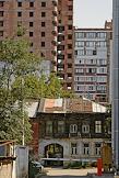 Старый двухэтажный дом на фоне строящейся многоэтажки.