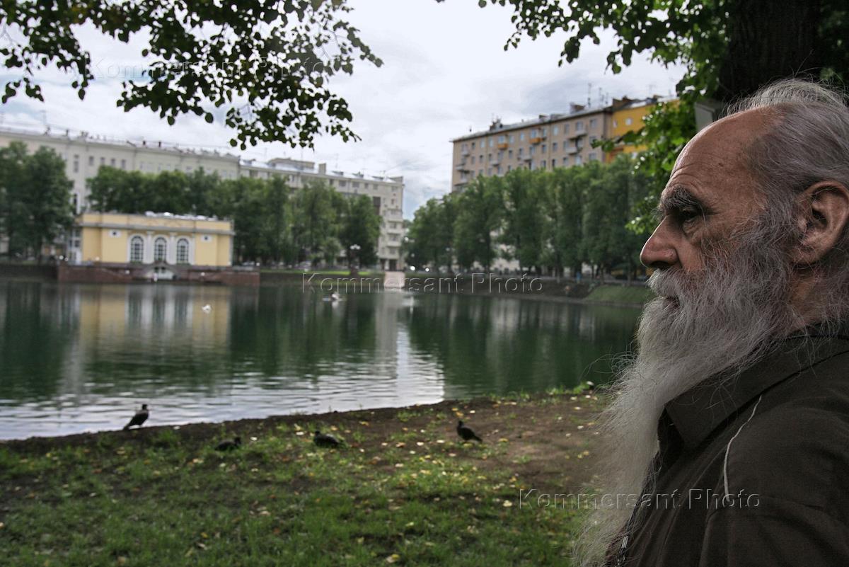 Виды Москвы. Патриаршие пруды. Пожилой мужчина во время прогулки у пруда.