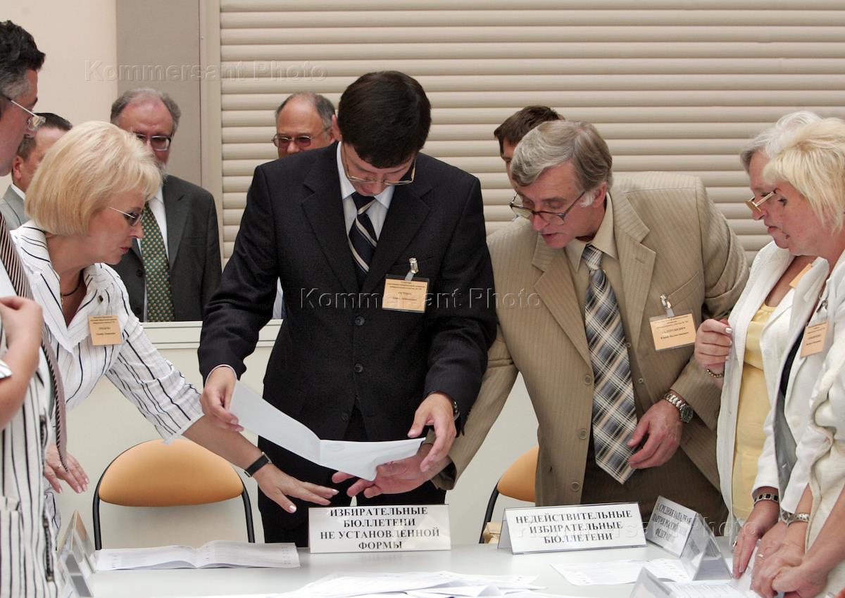 Член Центризбиркома (ЦИК) России Геннадий Райков (справа) во время открытия модельного избирательного участока. В ходе тренировки прошла проверка работы и взаимодействия избирательных участков по вводу избирательных бюллетеней в автоматизированную систему ГАС "Выборы". Тренировка прошла в здании ЦИК.
